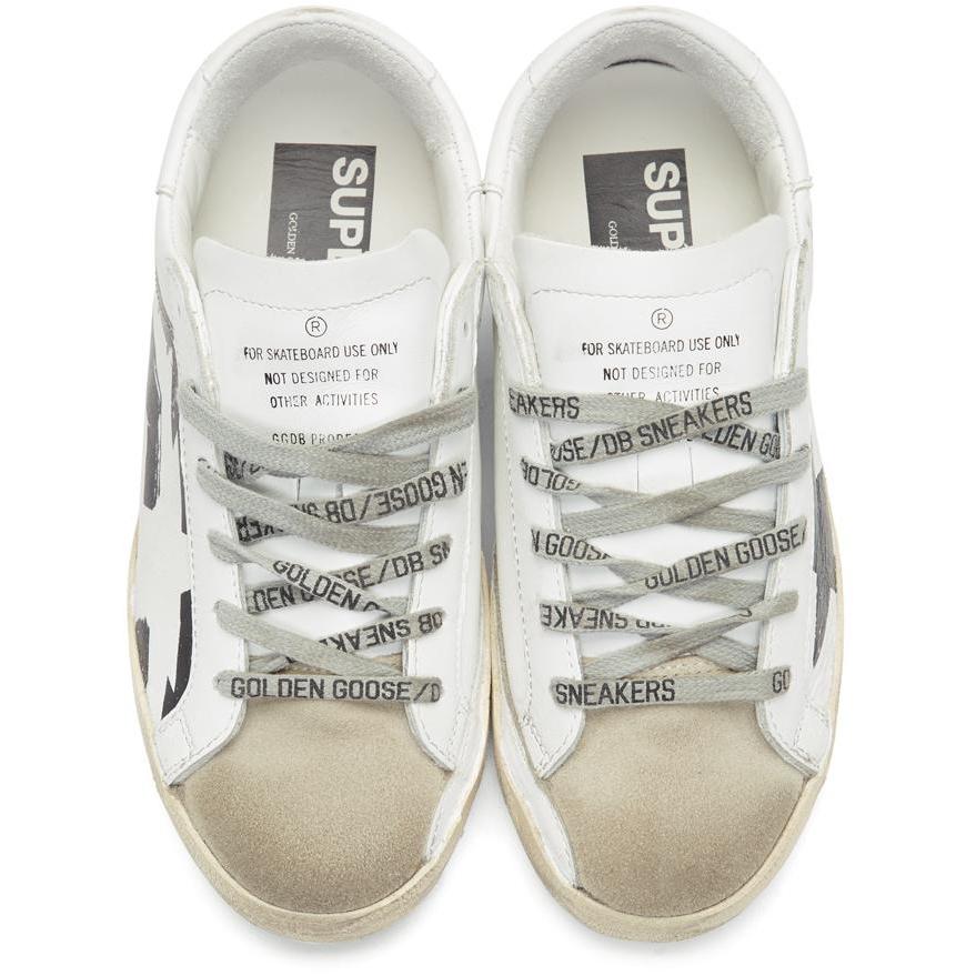 Low-top crinkled leather and suede sneakers in white. Round toe. Logo-printed lace-up closure in grey. Graphic printed in black at padded tongue. Padded collar. Perforated detailing and graphic printed in black at sides. Logo engraved at heel tab. Off-white rubber midsole featuring smudging throughout. Treaded rubber outsole in black. Supplier color: White Upper: leather. Sole: rubber. Brand: Golden Goose