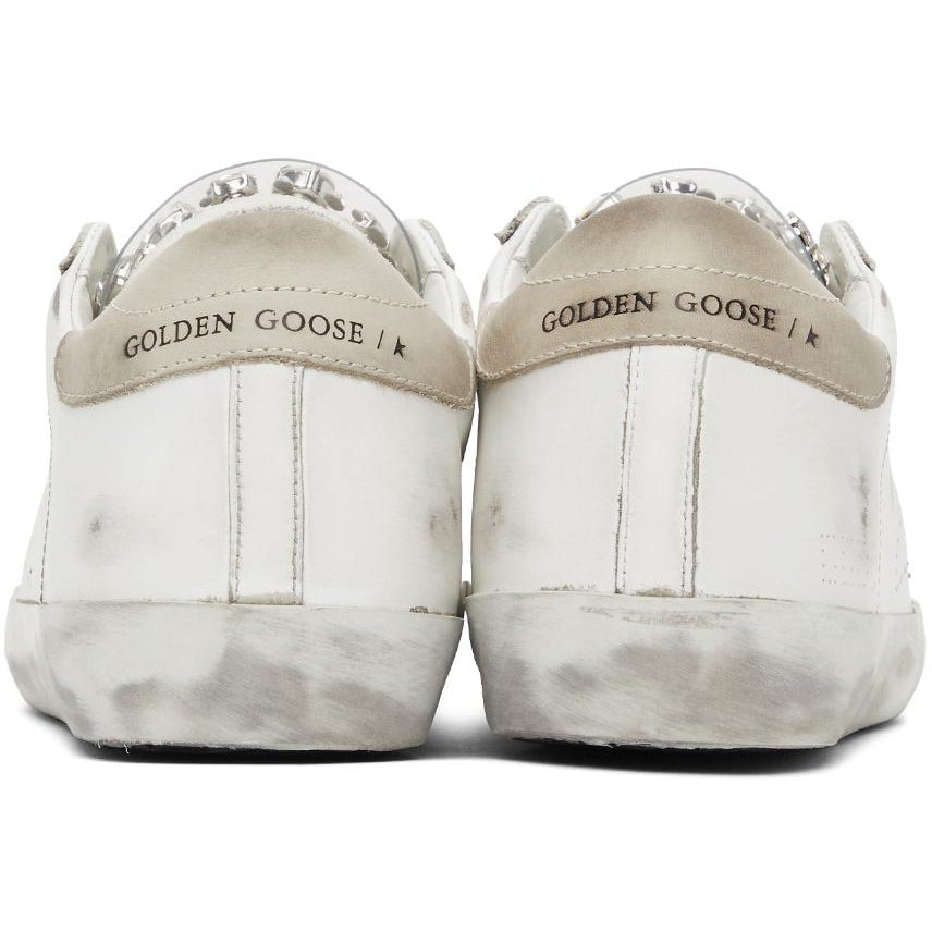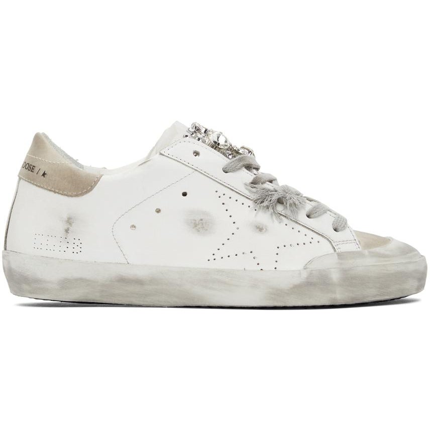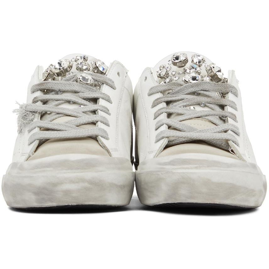Low-top buffed leather sneakers in white. Smudging and distressing throughout. Trim in beige at round toe. Lace-up closure in grey. Transparent rubber trim featuring rhinestone accents at padded tongue. Padded collar. Perforated detailing at sides. Logo printed in black at beige leather heel tab. Rubber midsole in off-white. Treaded rubber outsole in black. Silver-tone hardware. Supplier color: White Upper: leather. Sole: rubber. Brand: Golden Goose