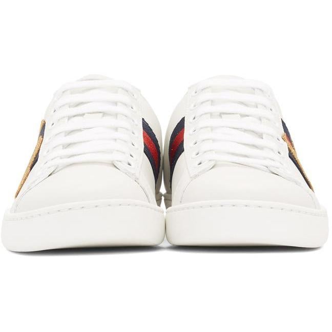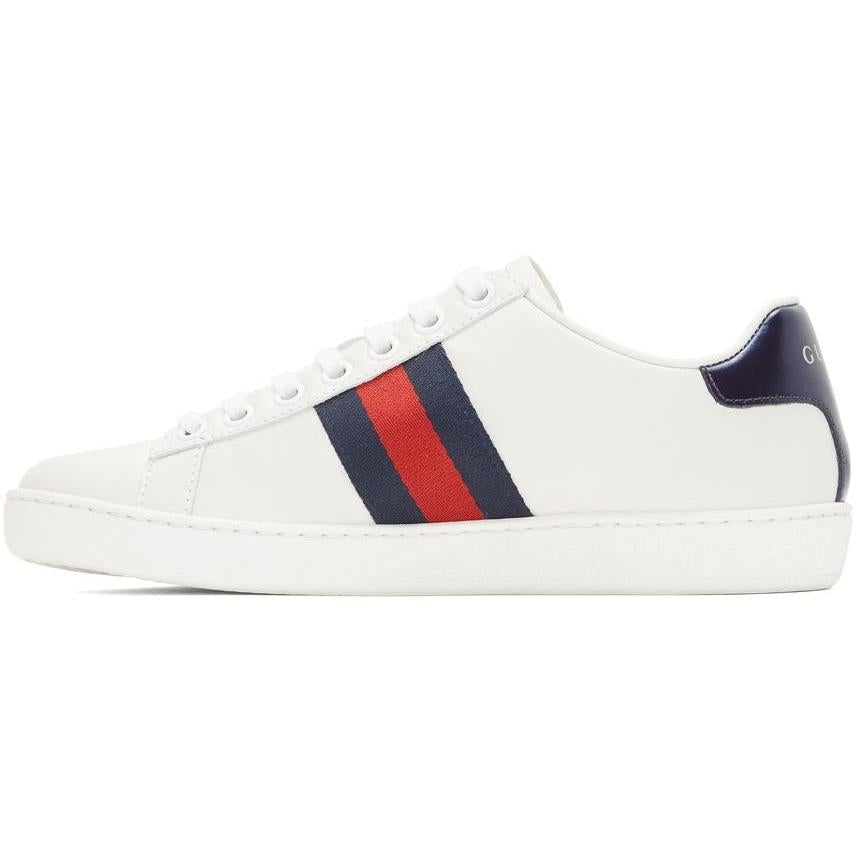 Low-top buffed leather sneakers in white. Round toe. Tonal lace-up closure. Padded tongue and collar. Signature web stripes in red and green at sides. Text embroidered in gold-tone at outer sides. Logo printed in white at mismatched blue and red leather heel tab. Tonal treaded rubber sole. Tonal stitching. Upper: leather. Sole: rubber. Brand: Gucci