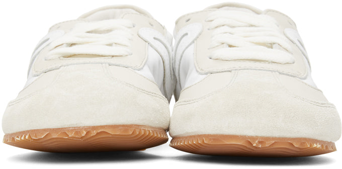 Low-top paneled technical satin, suede, and grained calfskin sneakers colorblocked in white and off-white. Round toe. Tonal lace-up closure. Embossed logo patch at padded tongue. Partially elasticized heel collar. Heel tab in off-white. Leather logo appliqué in white at sides. Buffed leather lining. Treaded crepe rubber outsole in brown. Supplier color: White/Off-white Upper: calfskin, textile. Sole: rubber. Brand: Loewe