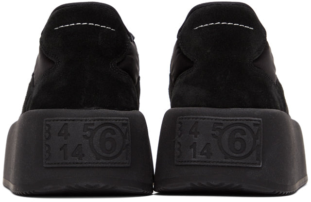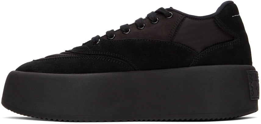 Low-top paneled suede and technical canvas sneakers in black. Round toe. Tonal lace-up closure. Logo embossed at padded tongue. Padded collar. Signature white stitching at heel tab. Tonal rubber platform midsole featuring embossed logo patch at heel. Tonal treaded rubber outsole. Tonal hardware. Approx. 2 platform. Supplier color: Black Upper: leather, textile. Sole: rubber. Brand: MM6 Maison Margiela