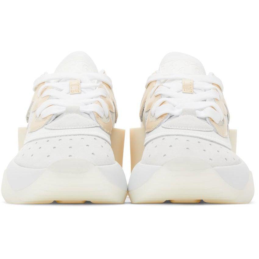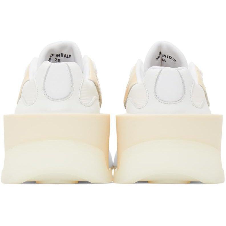 Low-top paneled buffed leather, suede, and ripstop sneakers colorblocked in white and grey. Patent leather trim in beige throughout. Round toe. Tonal lace-up closure. Rubberized logo patch at padded tongue. Padded collar. Platform rubber midsole in white and off-white featuring Air Sole unit. Treaded rubber outsole in off-white. Approx. 2 platform. Supplier color: White Upper: leather, textile. Sole: rubber. Brand: MM6 Maison Margiela