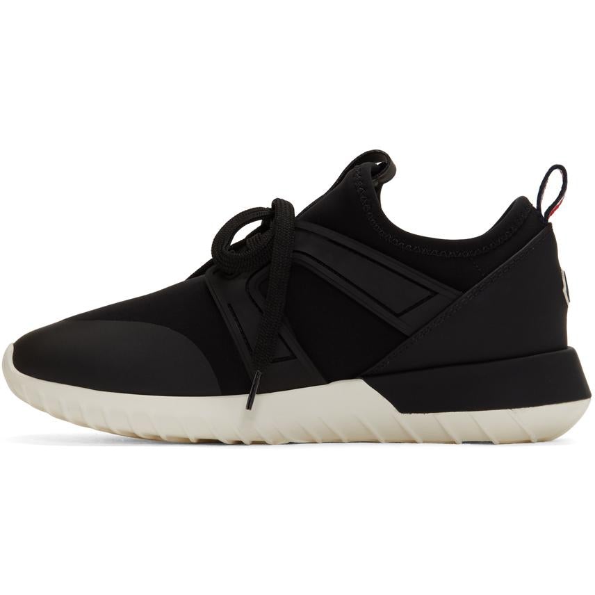 Low-top bonded jersey sneakers in black. Tonal rubberized trim at round toe. Tonal lace-up closure. Tonal rubberized leather pull-loop at bellows tongue. Tricolor webbing pull-loop at padded collar. Tonal rubberized leather heel counter featuring white rubber logo patch. Logo embossed at outer side. Treaded foam rubber sole in white and black. Supplier color: Black Upper: textile, leather. Sole: rubber. Brand: Moncler