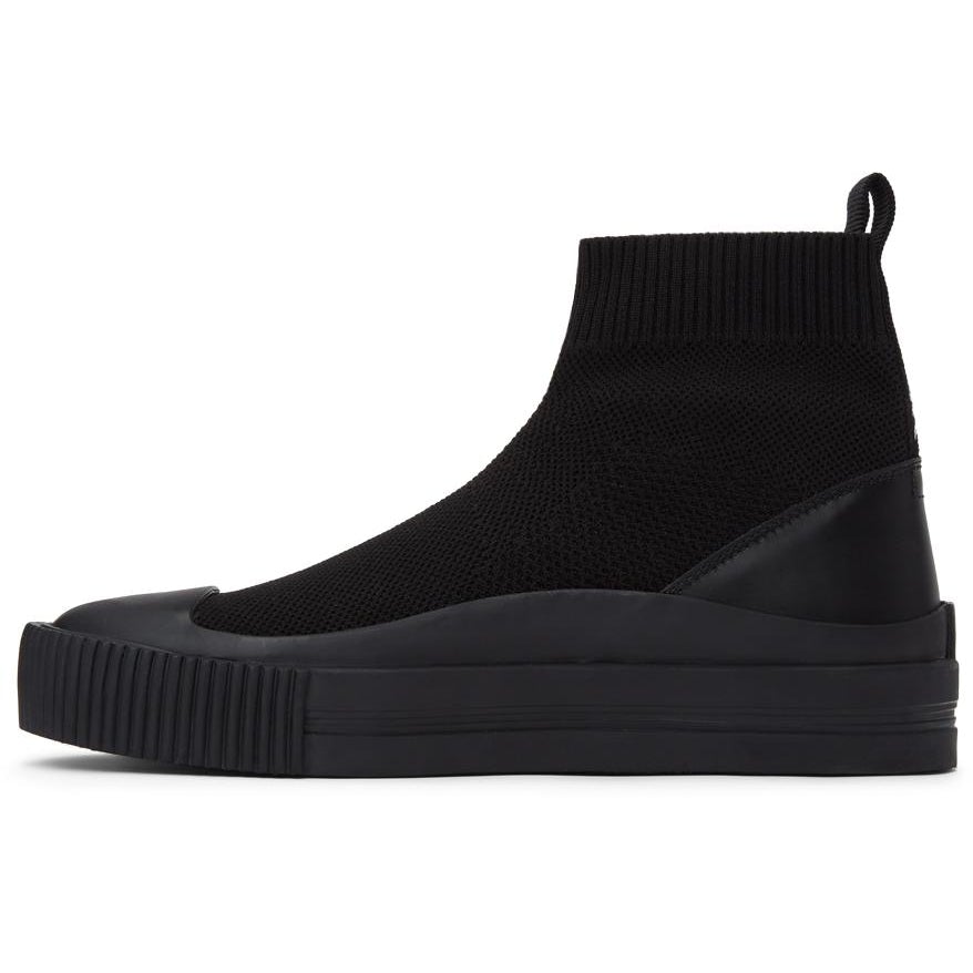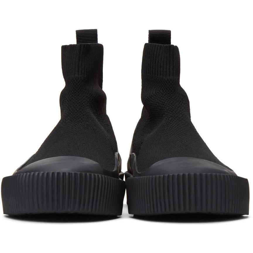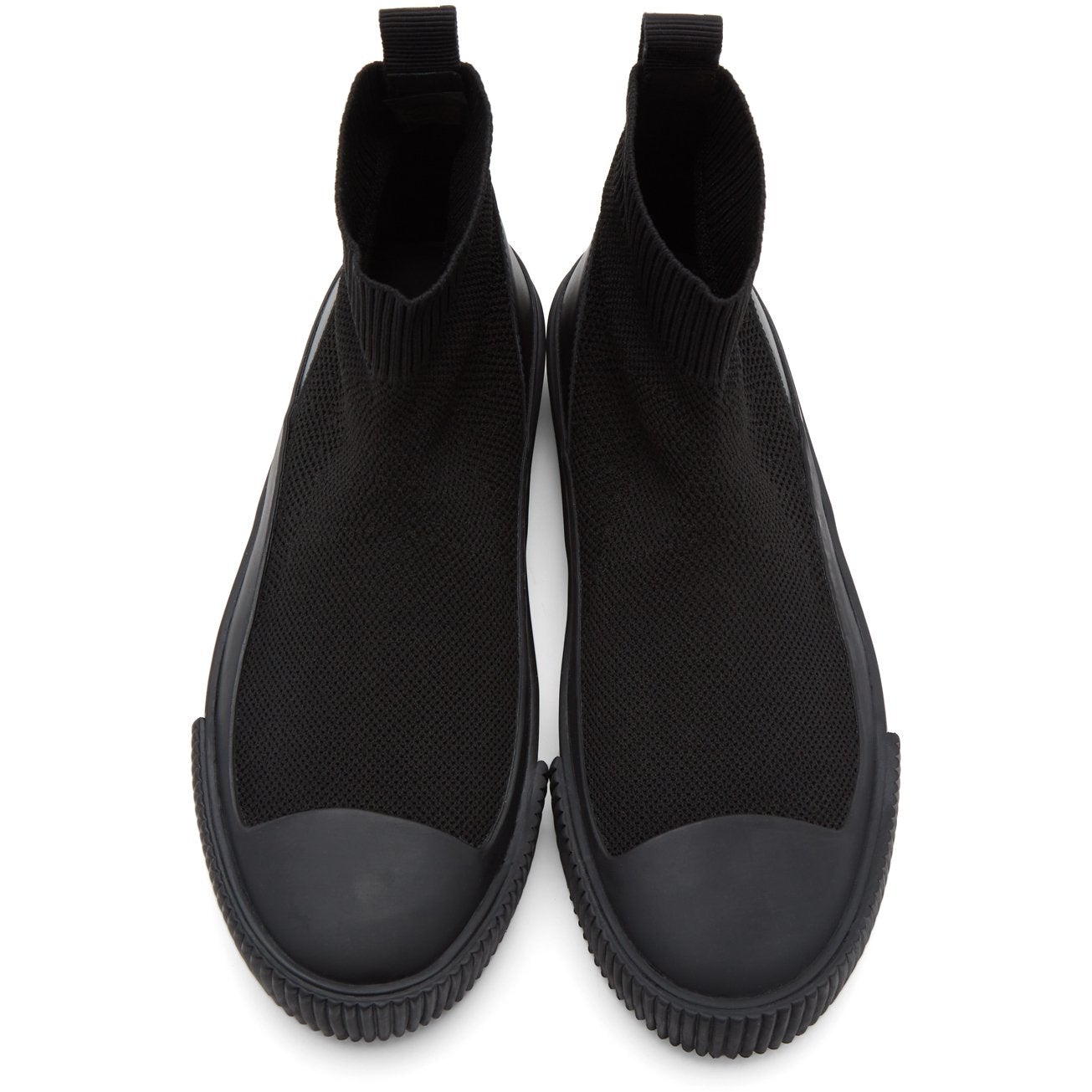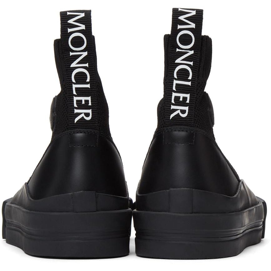 High-top nylon jersey sneakers in black. Round rubber cap toe. Rib knit collar. Tonal grosgrain pull-loop featuring logo in white at heel collar. Buffed leather trim at heel counter. Tonal rubberized logo patch at outer side. Tonal rubberized trim at welt. Tonal treaded rubber sole. Supplier color: Black Upper: textile, calfskin. Sole: rubber. Brand: Moncler