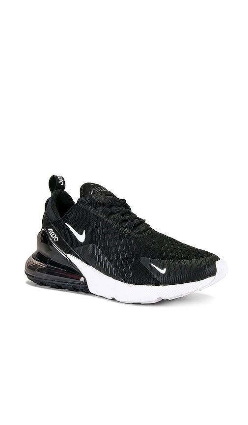 Nike Air Max 270 in Black. - size 10 (also in 10.5, 11, 11.5, 12, 13, 14, 7, 7.5, 8, 8.5, 9, 9.5, M12.5 / W14) Nike Air Max 270 in Black. - size 10 (also in 10.5, 11, 11.5, 12, 13, 14, 7, 7.5, 8, 8.5, 9, 9.5, M12.5 / W14) Mesh knit upper with rubber sole. Made in Indonesia. Lace-up front. NIKR-MZ12. AH8050-002. Centered around humanity and athletic innovations, Nike believes that if you have a body, you are an athlete. From footwear to an incredible variety of clothing, Nike is about enhancing performance while looking and feeling your best. Many of their shoe styles have become rare collector?s items because of their limited quantity and unique, yet classic design. Their-performance focused technologies have revolutionized athletic wear, while their exclusive fabrics such as Dri-Fit, AeroReact, and Storm-Fit highlight both function and aesthetics. Beyond apparel, Nike invests in the power of people, planet, and play with practices that seek to better serve the environment and support women in the workforce. Shop the latest in fashion from Nike