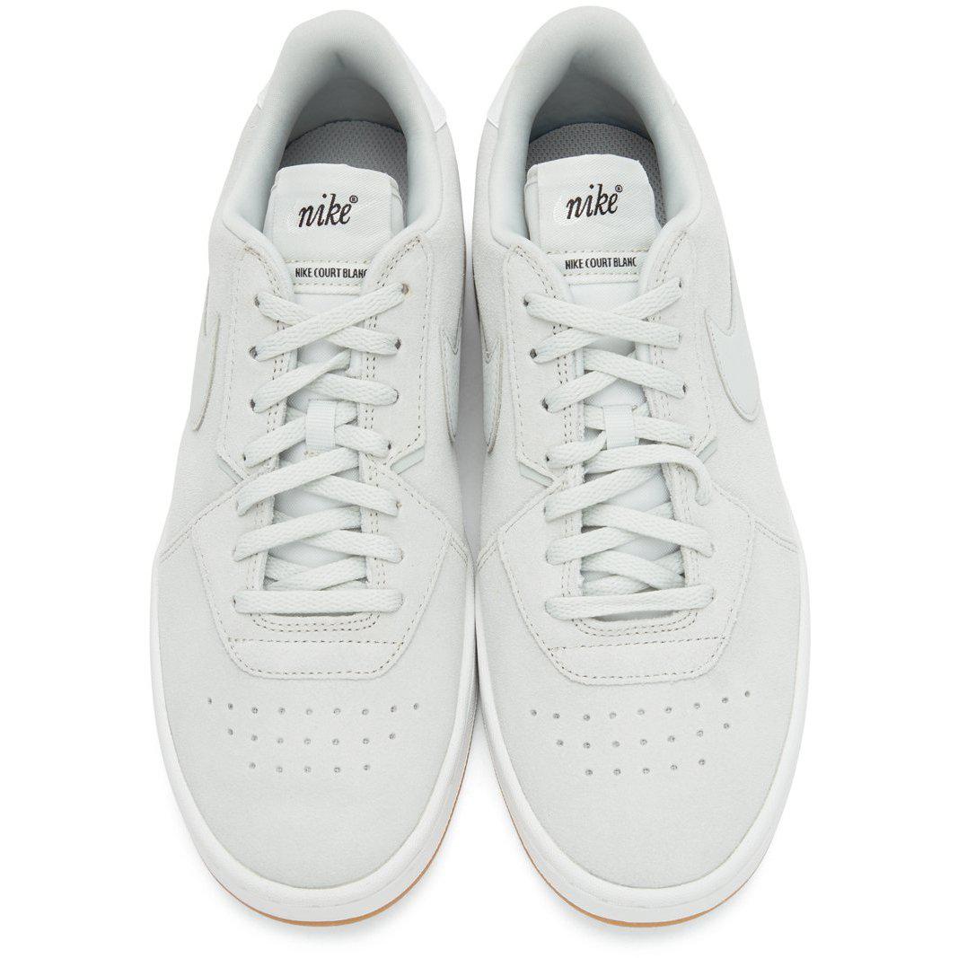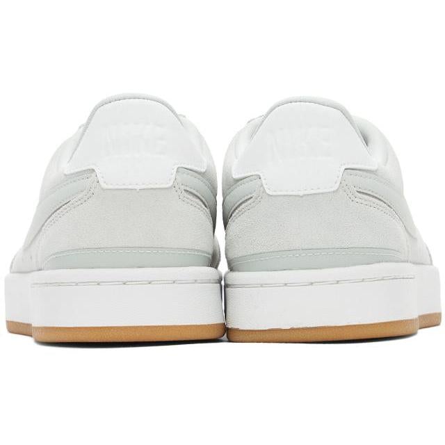 Low-top suede sneakers in green. Perforated detailing at round toe. Tonal lace-up closure. Textile logo patch at padded tongue. Padded collar. Tonal grained leather Swoosh appliqué at sides. Logo embossed at white grained leather heel tab. Textured rubber midsole in white. Treaded rubber outsole in tan. Supplier color: Light silver Upper: leather. Sole: rubber. Brand: Nike