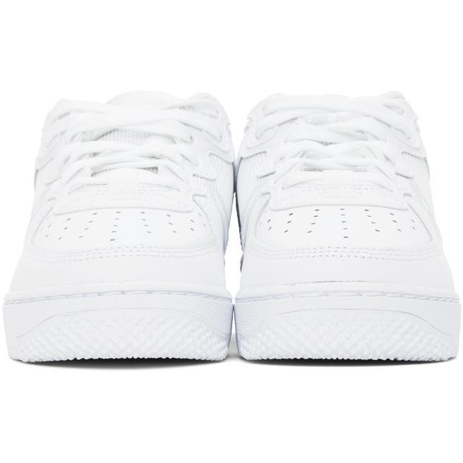 Low-top buffed faux-leather sneakers in white. Perforated detailing at round toe. Tonal lace-up closure. Textile logo patch at padded tongue. Logo embroidered in silver-tone at padded heel collar. Signature Swoosh graphic printed in grey at sides. Tonal mesh lining. Textured rubber midsole featuring embossed logo and trim in grey at outer side. Tonal treaded rubber outsole featuring signature React technology. Supplier color: White Upper: synthetic. Sole: rubber. Brand: Nike