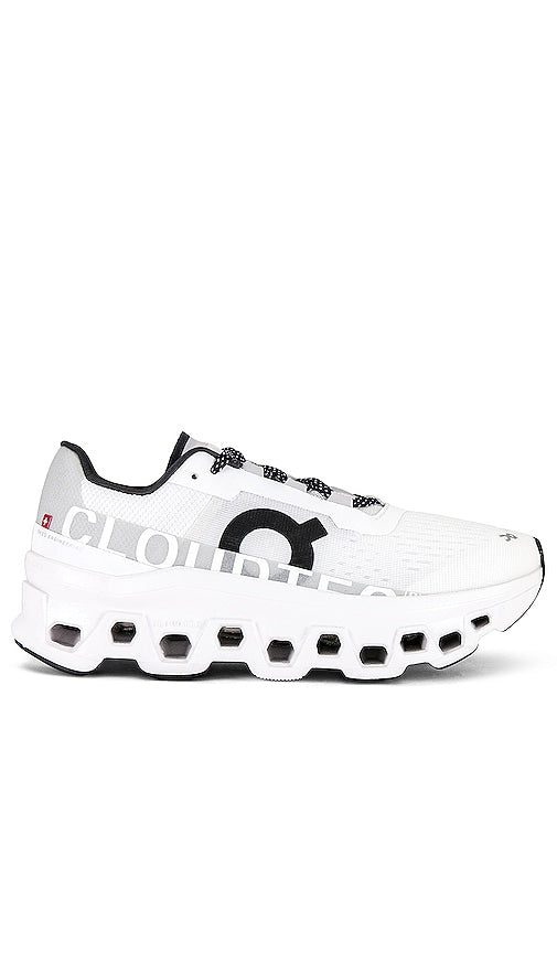 Mesh and textile upper with rubber sole. Made in Vietnam. Lace-up front. Designed to be the ultimate CloudTec® experience, it propels you forward stride after stride. Lightly padded collar. CloudTec logo at side panels. ONR-WZ76. 61.98285. Color: All White Cloudmonster. Shop All White Cloudmonster Athletic Sneakers for women and the latest On shoes now.