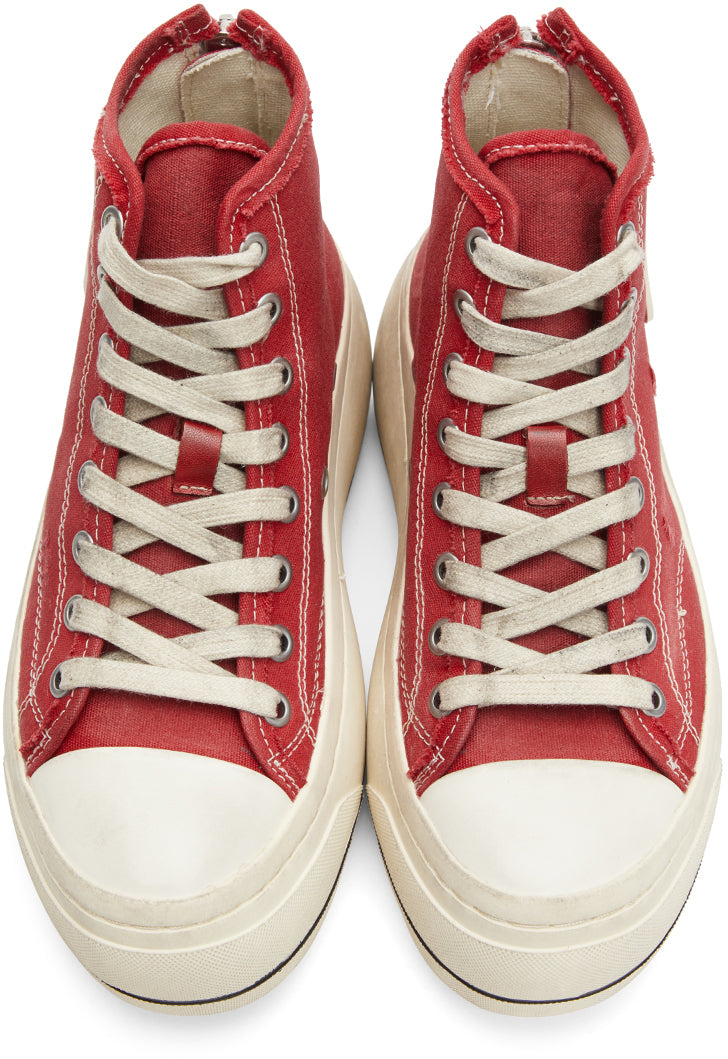 High-top canvas sneakers in red. Smudging and distressing throughout. Round rubber cap toe in white. Lace-up closure in white. Zip closure at heel collar. Rubberized logo patch in white at outer side. Eyelet vents at inner side. Treaded rubber platform sole in white and black. Silver-tone hardware. Approx. 2 platform. Supplier color: Red Upper: textile. Sole: rubber. Brand: 13
