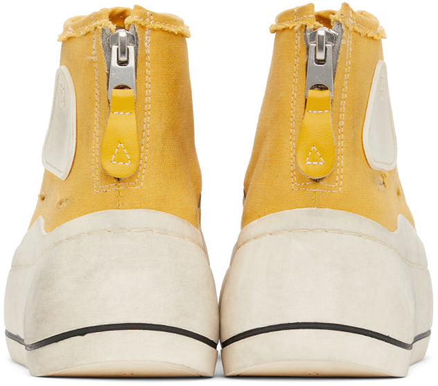 High-top canvas sneakers in yellow. Smudging and distressing throughout. Round rubber cap toe in white. Lace-up closure in white. Zip closure at heel collar. Rubberized logo patch in white at outer side. Eyelet vents at inner side. Treaded rubber platform sole in white and black. Silver-tone hardware. Approx. 2 platform. Supplier color: Gold Upper: textile. Sole: rubber. Brand: 13