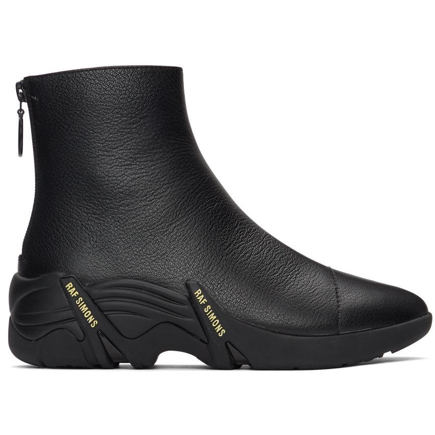 High-top grained leather sneakers in black. Tonal topstitching at round toe. Zip closure at heel. Buffed leather lining. Tonal textured rubber midsole featuring logo embossed in black and off-white at sides. Tonal treaded rubber outsole. Tonal hardware. Supplier color: Black Upper: leather. Sole: rubber. Brand: Raf Simons
