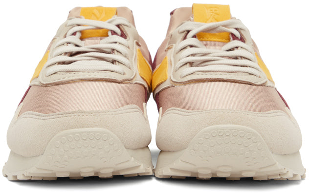 Low-top satin sneakers in beige. Suede trim in grey, burgundy, and yellow throughout. Round toe. Tonal lace-up closure. Suede logo flag in yellow at padded tongue. Padded collar. Foam rubber midsole. Tonal treaded rubber outsole. Supplier color: Stucco Upper: textile, leather. Sole: rubber. Brand: Reebok By Victoria Beckham