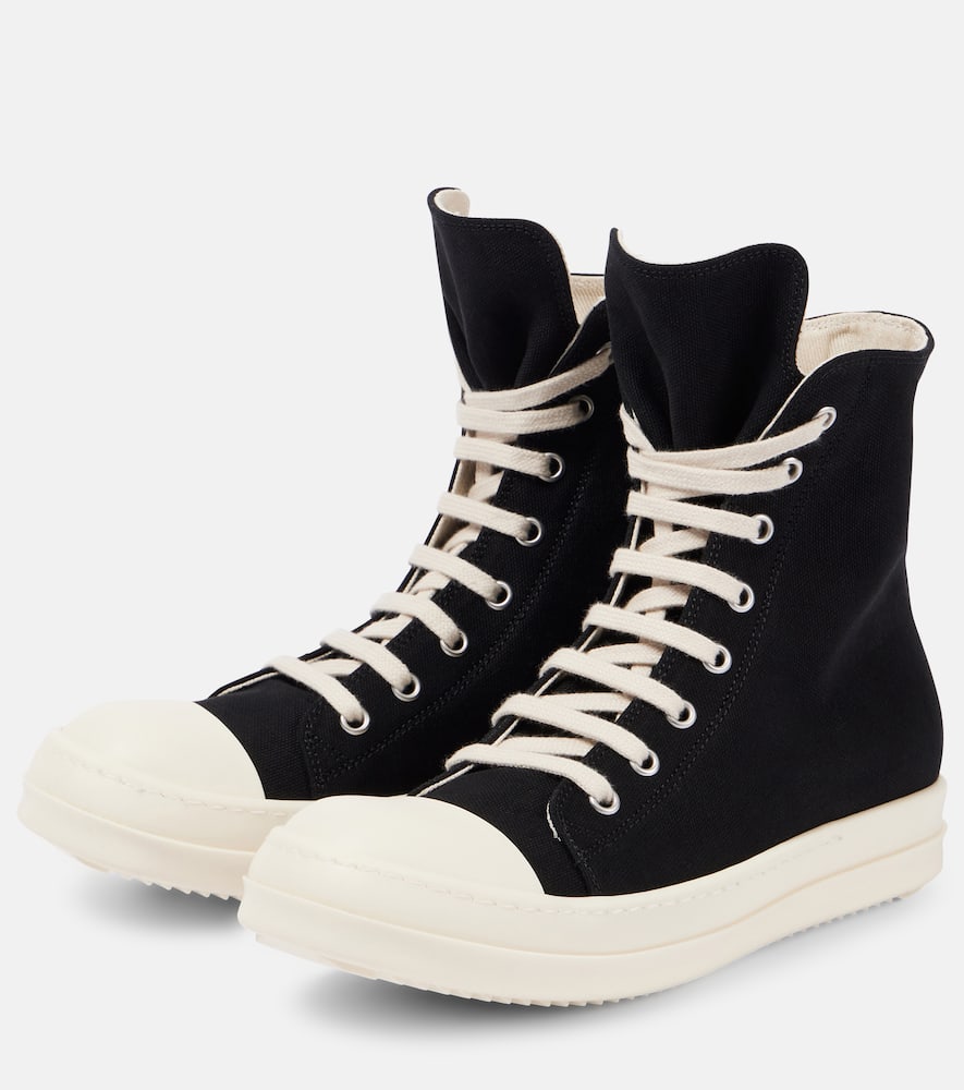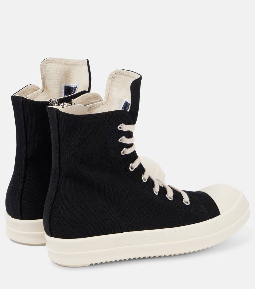 Upper: fabric. Lining: fabric. Sole: leather insole, rubber sole. Toe shape: round toe. Made in Italy. Includes: shoe box, dust bag. Designer color name: Black/ Milk/ Milk. Closure: lace-up, zipped side. Hardware color: silver. Shop the latest Rick Owens High-Top Sneakers for women now.