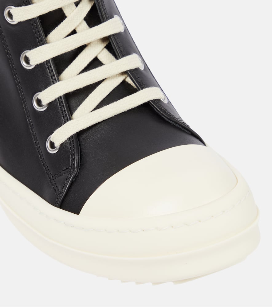 Sole: leather insole, rubber sole. Toe shape: round toe. Closure: zipped side, lace-up. Upper: leather. Designer color name: Black/Milk/Milk. Comes with a box. Made in Italy. Comes with dust bag. Shop the latest Rick Owens High-Top Sneakers for women now.