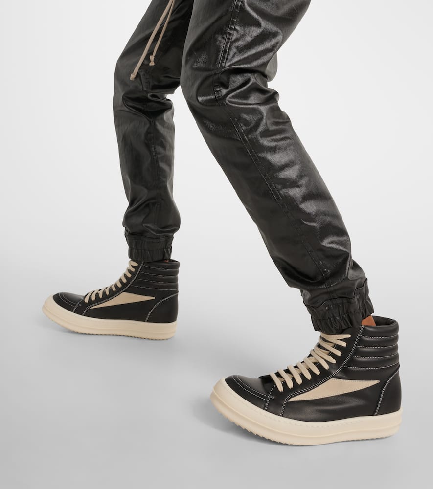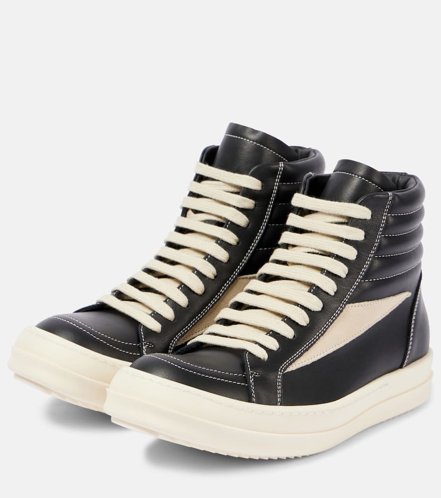 Upper: calf leather. Lining: leather. Sole: leather insole, rubber sole. Toe shape: round toe. Made in Italy. Includes: dust bag, shoe box. Designer color name: Black/Milk/Milk. Closure: lace-up. Shop the latest Rick Owens High-Top Sneakers for women now.