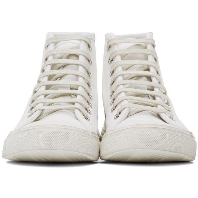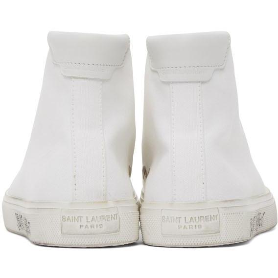 High-top canvas sneaker in white. Smudging and distressing throughout. Round toe. Tonal lace-up closure. Embossed logo at padded tongue. Logo patch at heel. Tonal rubber midsole featuring printed logo in black. Tonal treaded rubber outsole. Silver-tone hardware. Supplier color: White Upper: canvas, leather. Sole: rubber. Brand: Saint Laurent