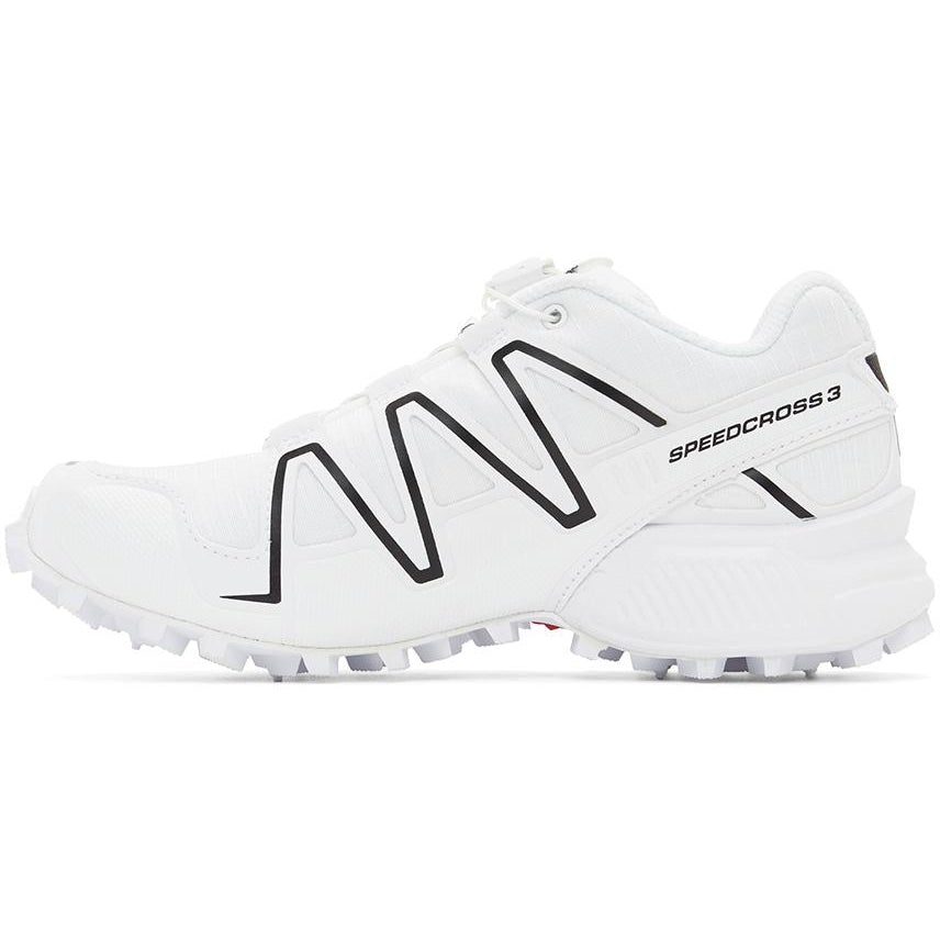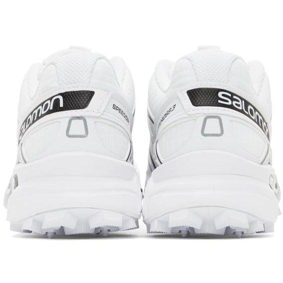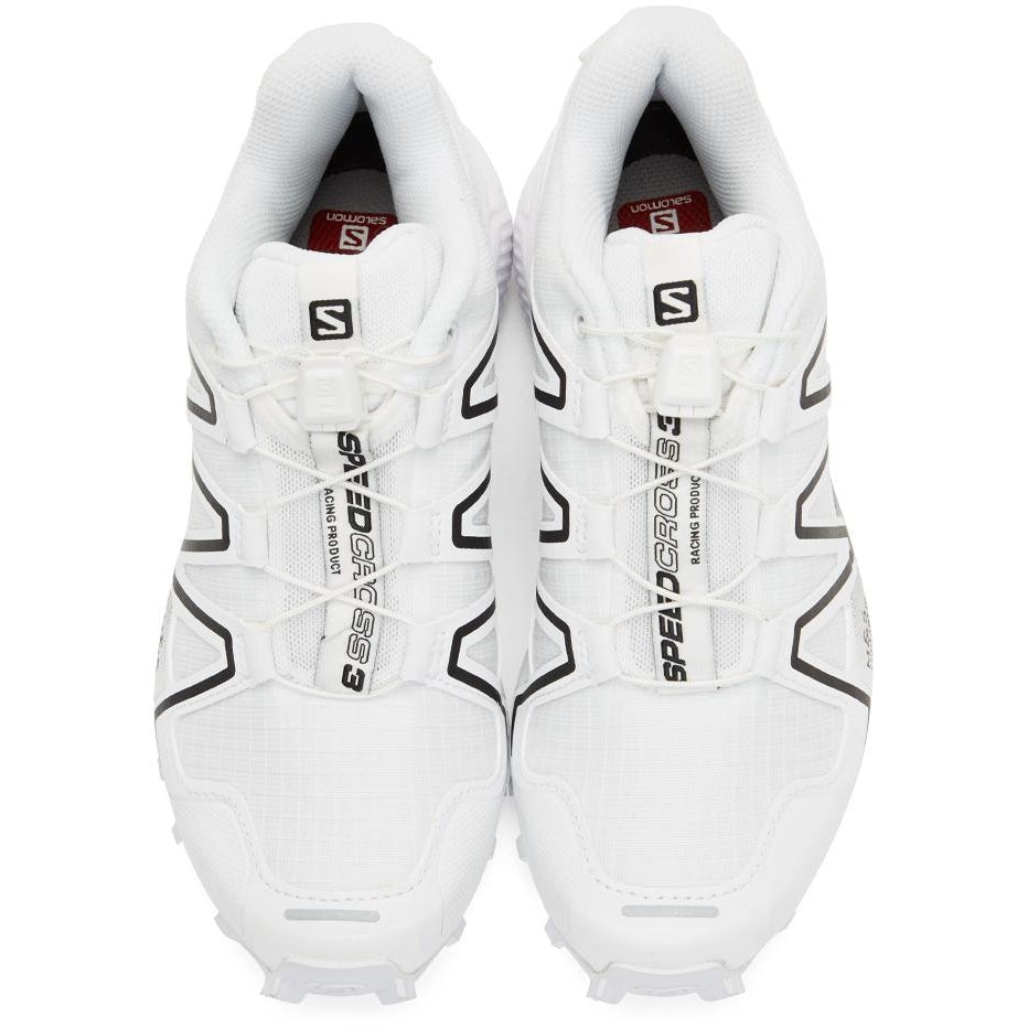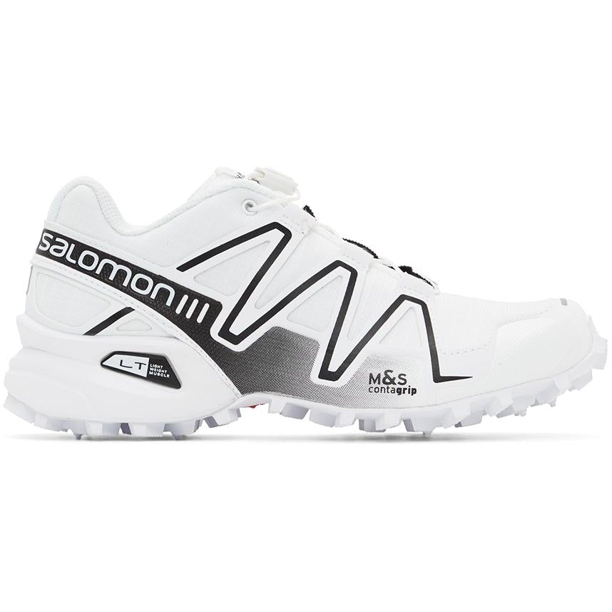 Low-top mesh sneakers in white featuring buffed faux-leather trim in black throughout. Logo embossed at round toe. Textile logo flag at bungee-style Quicklace® closure. White and black logo flag at mesh tongue. Padded collar. Rubberized trim and logos printed in white and black at sides. Tonal foam rubber midsole. Tonal treaded rubber Contragrip® outsole. Tonal hardware. Fit runs large. We advise sizing down. Supplier color: White/Alloy Upper: textile, synthetic. Sole: rubber. Brand: Salomon