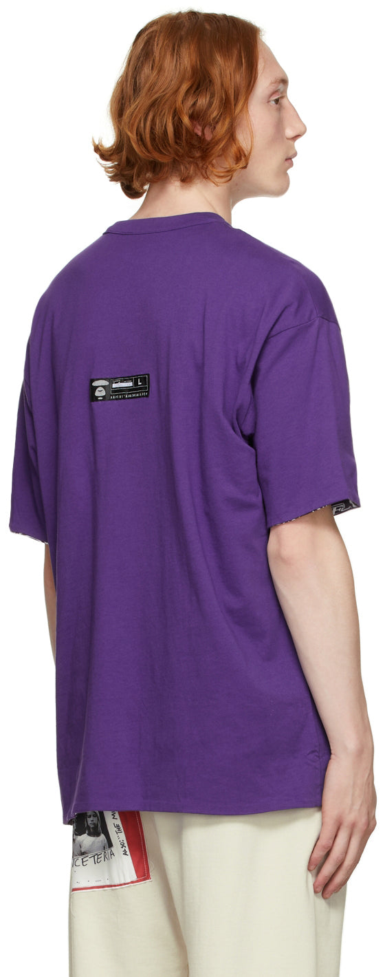 Reversible short sleeve cotton jersey T-shirt in purple. Rib knit crewneck collar. Logo printed in black and white at chest. Textile logo patch in black, white, and grey at back. Reverse featuring printed graphic pattern in white, black and tones of purple. Supplier color: Purple 100% cotton. Brand: AAPE by A Bathing Ape