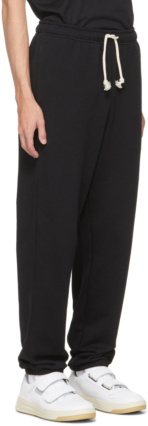 Relaxed-fit organic cotton French terry lounge pants in black. Mid-rise. Three-pocket styling. Drawstring in off-white at elasticized waistband. Tonal embroidered logo appliqué at front. Elasticized cuffs. Supplier color: Black 100% organic cotton. Brand: Acne Studios
