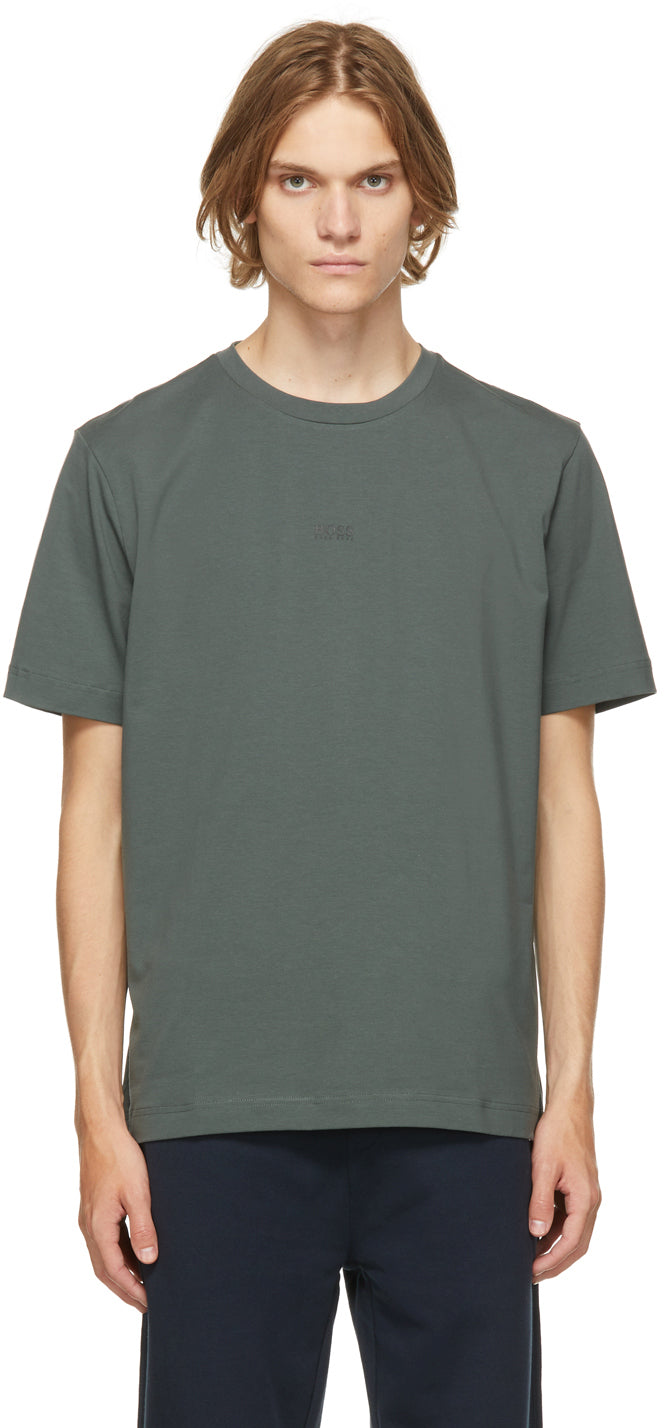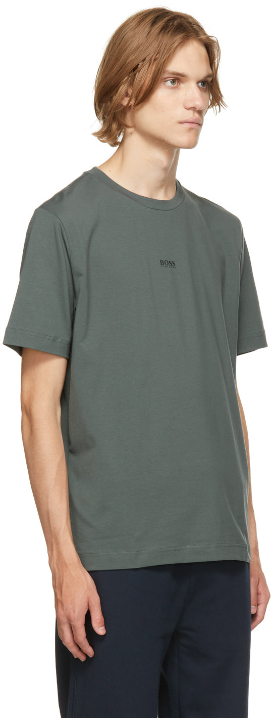 Short sleeve stretch cotton jersey T-shirt in green. Rib knit crewneck collar. Rubberized logo appliqué in black at chest. Supplier color: Dark green 96% cotton, 4% elastane. Brand: Boss