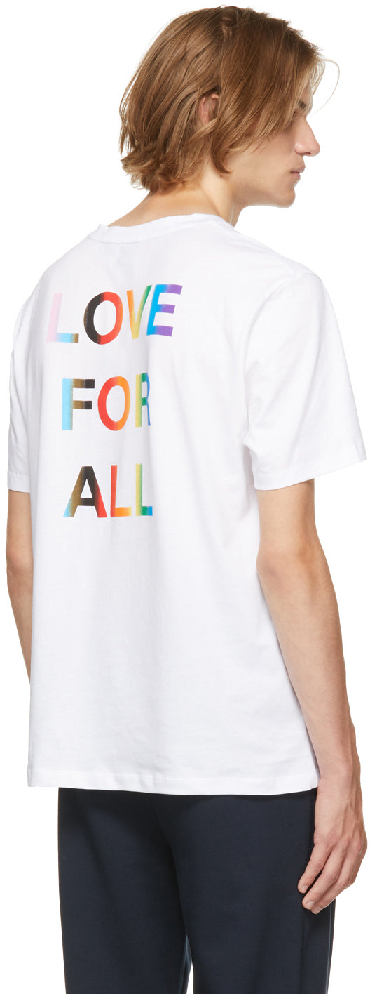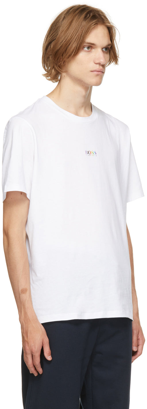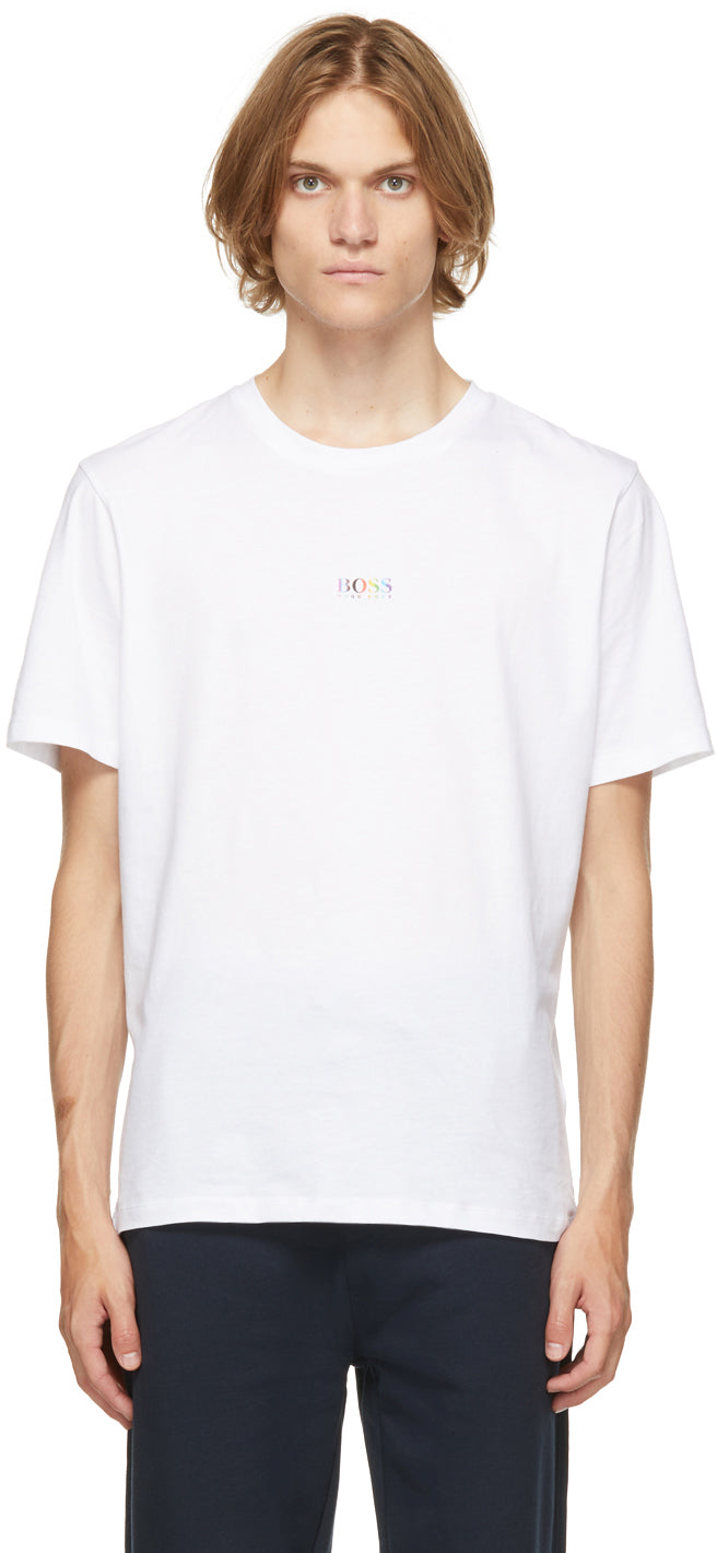 Short sleeve cotton jersey T-shirt in white. Rib knit crewneck collar. Logo printed in multicolor at chest. Text printed in multicolor at back. Supplier color: White 100% cotton. Brand: Boss