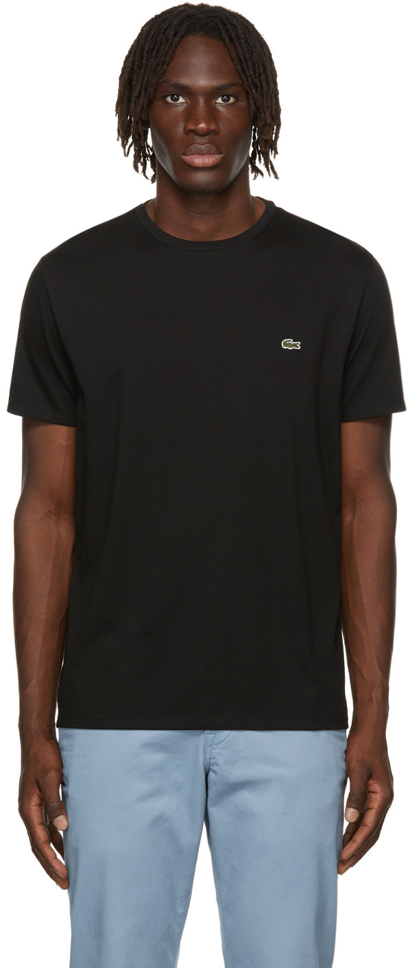 Short sleeve pima cotton jersey T-shirt in black. Rib knit crewneck collar. Logo patch in white and green at chest. Supplier color: Black 100% pima cotton. Brand: Lacoste