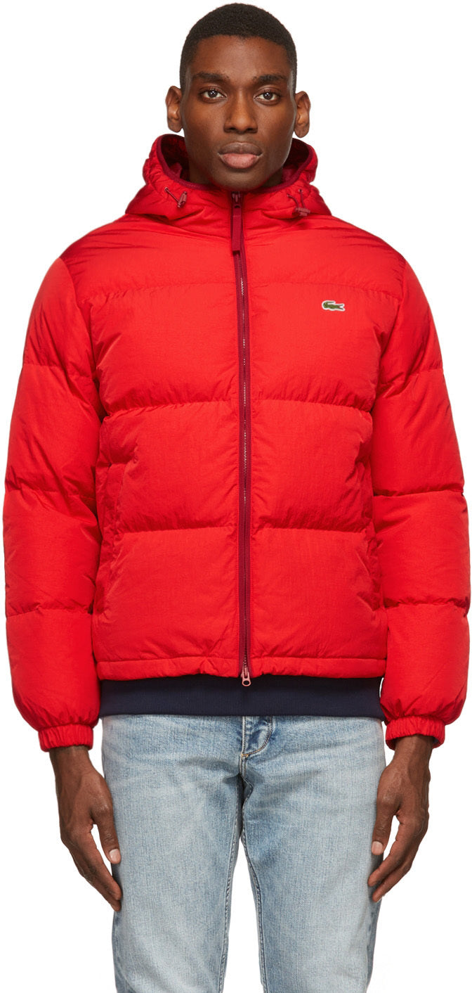 Long sleeve down-filled water-resistant nylon taffeta jacket in red. Bungee-style drawstring and elasticized trim at hood. Two-way zip closure at front. Embroidered logo appliqué in green, red, and black at chest. Welt pockets at waist. Concealed bungee-style drawstring at hem. Elasticized cuffs. Mesh patch pocket at interior. Full nylon satin lining. Tonal hardware. Supplier color: Red Fill 1: 80% down, 20% feathers. Fill 2: 100% polyester. Body: 100% polyamide. Lining: 100% polyamide. Brand: Lacoste
