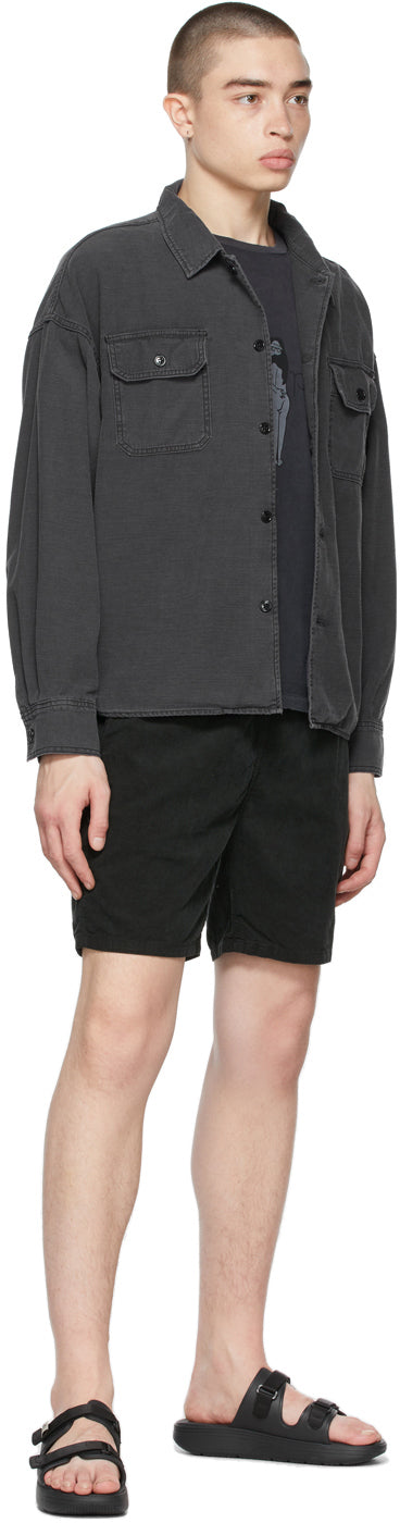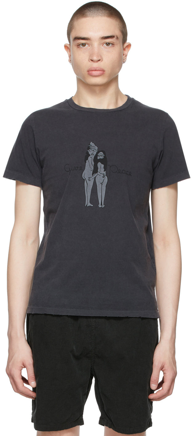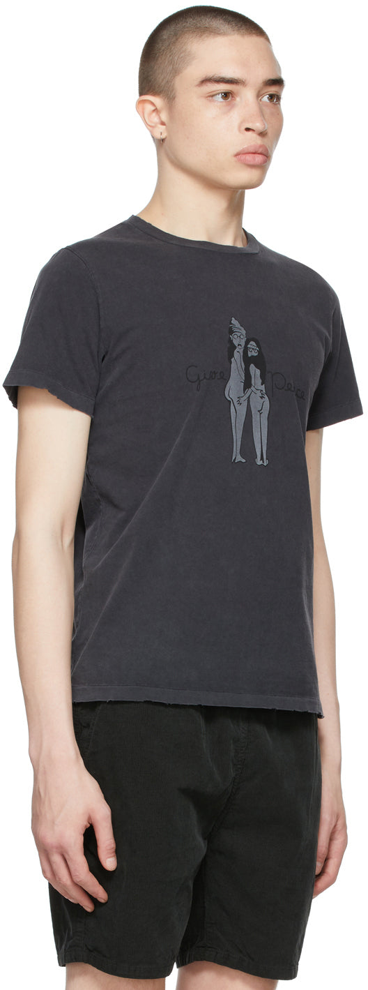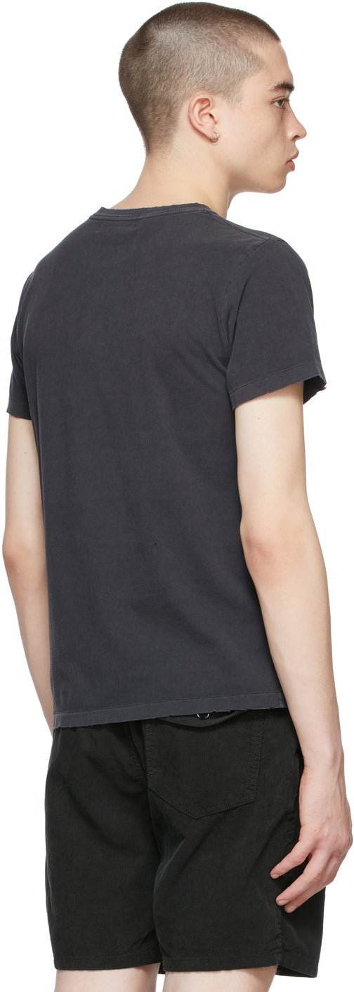 Short sleeve garment-dyed cotton jersey T-shirt in black. Fading and distressing throughout. Rib knit crewneck collar. Text and graphic printed in black and grey at front. Supplier color: Black 100% cotton. Brand: Remi Relief