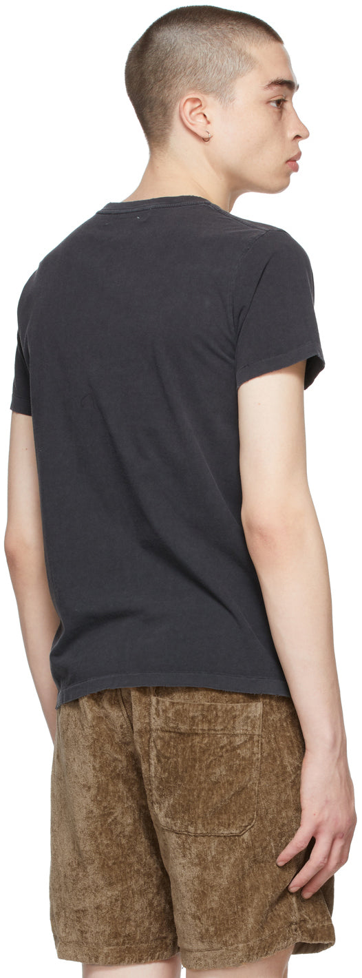 Short sleeve garment-dyed cotton jersey T-shirt in black. Fading and distressing throughout. Rib knit crewneck collar. Text embroidered in beige at front. Supplier color: Black 100% cotton. Brand: Remi Relief