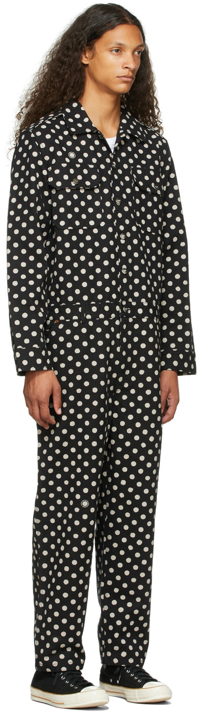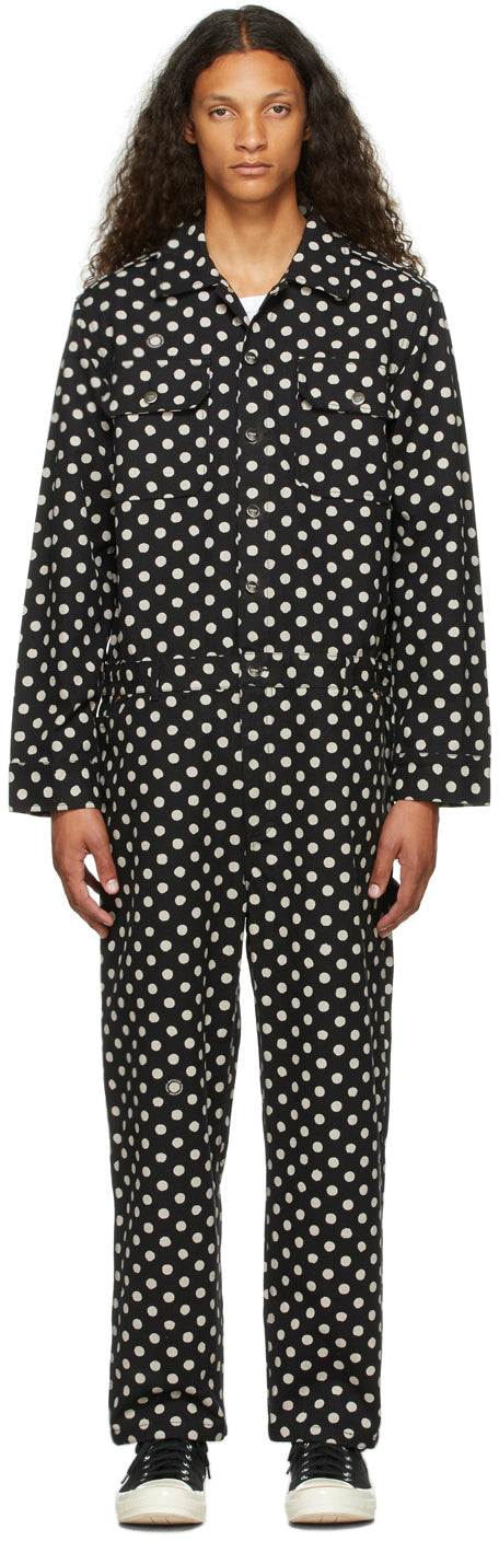 Long sleeve non-stretch organic cotton denim jumpsuit in black featuring polka dot pattern in off-white. Spread collar. Button closure at front. Flap pockets at chest. Single-button barrel cuffs. Straight-leg. Mid-riser. Five-pocket styling. Belt loops at waistband. Hammer loop and patch pocket at back. Zip-fly. Logo-engraved silver-tone and copper-tone hardware. Supplier color: Black 100% organic cotton. Brand: Vyner Articles