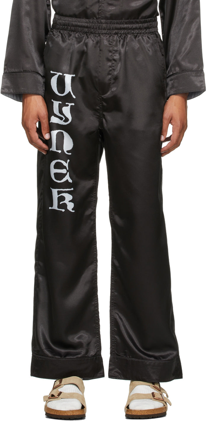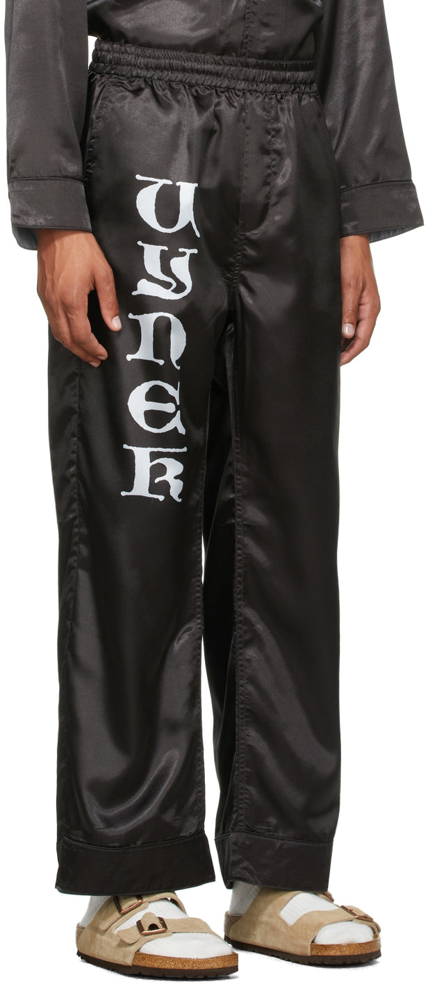 Relaxed-fit satin lounge pants in black. Mid-rise. Three-pocket styling. Concealed drawstring at elasticized waistband. Logo printed in white at front leg. Tonal piping at cuffs. Logo graphic printed in white at back pocket. Supplier color: Black 100% polyester. Brand: Vyner Articles