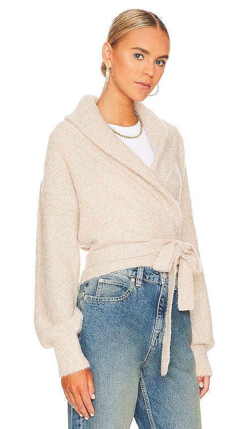 525 Boucle Ballerina Wrap in Beige. - size L (also in XL) 525 Boucle Ballerina Wrap in Beige. - size L (also in XL) 98% polyester 2% nylon. Made in China. Machine wash. Front wrap tie closure. Foldover neckline. Ribbed cuffs. Fuzzy knit fabric. 525A-WK606. 110005874. A favorite of celebrity stylists, the 525 story began in Brooklyn in 1983. The secret to its industry staying power and stellar reputation: A focus on high-quality cotton sweaters with a range that combines a solid foundation of staples and no shortage of seasonal trend-focused updates. The design team is constantly pushing their creative boundaries, developing new yarns and colors that appeal to all ages and budgets. Truly full spectrum, 525 offers something for everyone: from classic to cutting-edge; from cotton to cashmere. Shop the latest in fashion from 525