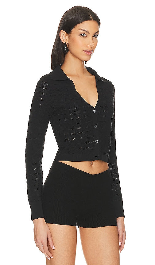 525 Cara Cropped Cardigan in Black. - size L (also in M, S, XL, XS) 525 Cara Cropped Cardigan in Black. - size L (also in M, S, XL, XS) 52% viscose 48% nylon. Made in China. Machine wash. Front button closure. Geometric open knit front and sleeves. Knit fabric. 525A-WK707. 110020938. A favorite of celebrity stylists, the 525 story began in Brooklyn in 1983. The secret to its industry staying power and stellar reputation: A focus on high-quality cotton sweaters with a range that combines a solid foundation of staples and no shortage of seasonal trend-focused updates. The design team is constantly pushing their creative boundaries, developing new yarns and colors that appeal to all ages and budgets. Truly full spectrum, 525 offers something for everyone: from classic to cutting-edge; from cotton to cashmere. Shop the latest in fashion from 525