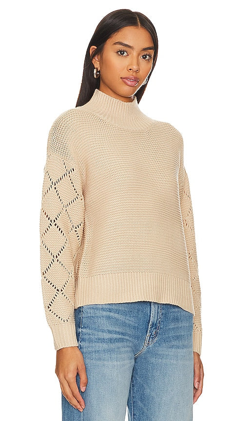 525 Talia Sweater in Beige. - size L (also in M, S, XL, XS) 525 Talia Sweater in Beige. - size L (also in M, S, XL, XS) 100% acrylic. Made in China. Machine wash. Mockneck styling. Midweight knit fabric with geometric eyelet sleeves. 525A-WK661. 110015706. A favorite of celebrity stylists, the 525 story began in Brooklyn in 1983. The secret to its industry staying power and stellar reputation: A focus on high-quality cotton sweaters with a range that combines a solid foundation of staples and no shortage of seasonal trend-focused updates. The design team is constantly pushing their creative boundaries, developing new yarns and colors that appeal to all ages and budgets. Truly full spectrum, 525 offers something for everyone: from classic to cutting-edge; from cotton to cashmere. Shop the latest in fashion from 525