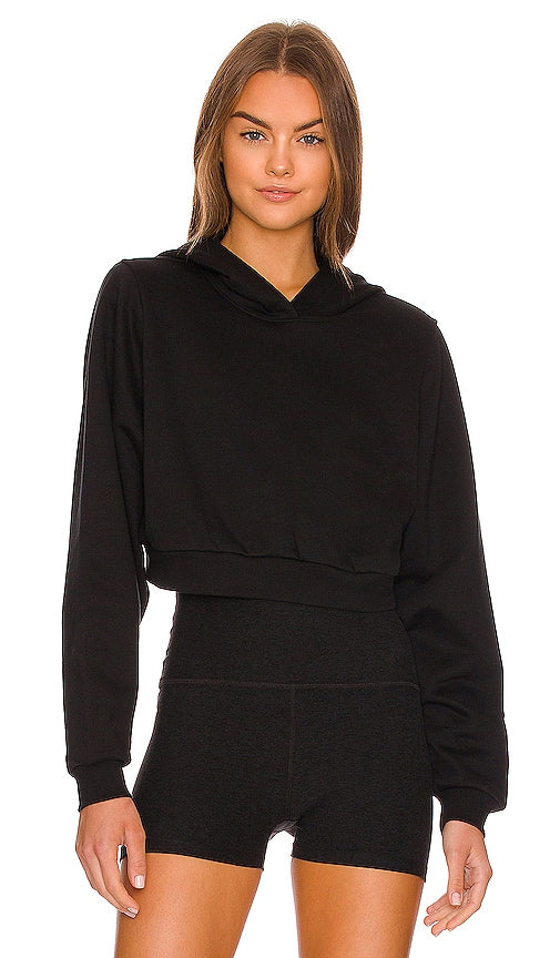 alo Cropped Go Time Padded Hoodie in Black. - size L (also in S, XS) alo Cropped Go Time Padded Hoodie in Black. - size L (also in S, XS) 65% cotton 35% poly. Made in China. Machine wash. Lightly padded shoulders. Back logo detail. Item not sold as a set. ALOR-WK64. W3662R. alo is fueled by good health, good feelings, good fabrics, the greater good. The LA-based, yoga-inspired line features pieces that are functional for everything from a light vinyasa flow to an intense bikram practice. The shorts, leggings, sports bras and tops are designed with movement in mind and employ quality materials that are ideal for wicking away sweat and moving with you. The yoga enthusiast behind the line know what you want when you practice inner peace, wellness and a bra that holds up during bridge pose. Shop the latest in fashion from alo