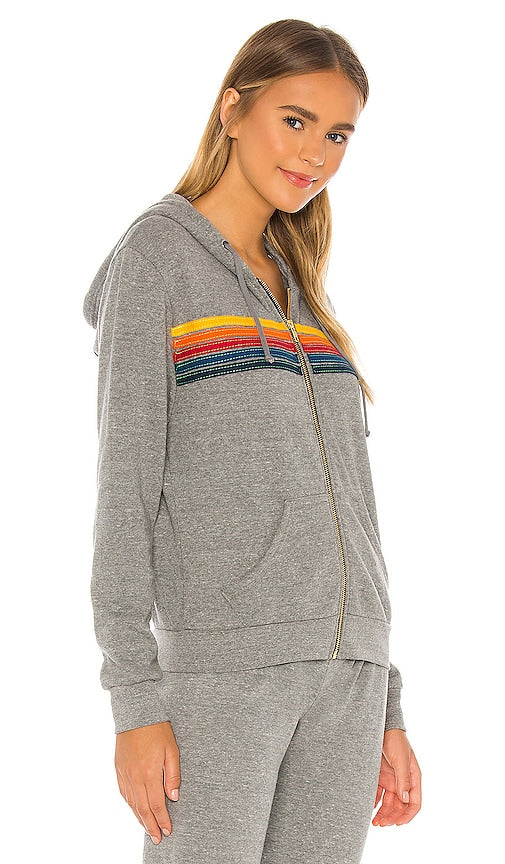 Aviator Nation 5 Stripe Zip Hoodie in Grey. - size L (also in M, S, XL, XS) Aviator Nation 5 Stripe Zip Hoodie in Grey. - size L (also in M, S, XL, XS) 50% cotton 37% poly 13% rayon. Front zipper closure. Side slant pockets with embroidered logo. Stitched patch accents. Fleece fabric. Made in USA. ANAT-WK1. HDRS5. Who doesn't have an obsession with vintage clothing? Paige Mycoskie, creator of Aviator Nation sure does. That's why she began studying the art of authentic vintage clothing and starting creating her own line of tee's, sweatshirts and hats to give the world that well worn feeling of so long ago. Shop the latest in fashion from Aviator Nation