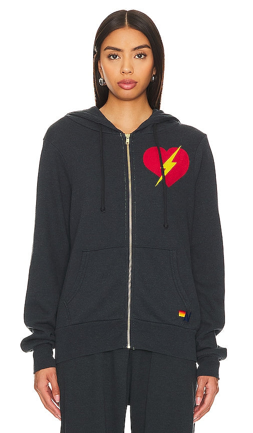 Aviator Nation Bolt Heart Zip Hoodie in Charcoal. - size L (also in M, S, XS) Aviator Nation Bolt Heart Zip Hoodie in Charcoal. - size L (also in M, S, XS) 50% polyester 38% cotton 12% rayon. Made in USA. Machine wash. Front zipper closure. Side slant pockets. Graphics at breast and back. Knit fabric with fleece lining. Item not sold as set. ANAT-WK89. HDBTHT. Who doesn't have an obsession with vintage clothing? Paige Mycoskie, creator of Aviator Nation sure does. That's why she began studying the art of authentic vintage clothing and starting creating her own line of tee's, sweatshirts and hats to give the world that well worn feeling of so long ago. Shop the latest in fashion from Aviator Nation