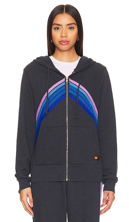 Aviator Nation Mountain Stitch Chevron Hoodie in Charcoal. - size L (also in M, S, XL, XS) Aviator Nation Mountain Stitch Chevron Hoodie in Charcoal. - size L (also in M, S, XL, XS) 50% polyester 38% cotton 12% rayon. Made in USA. Machine wash. Front zipper closure. Attached drawstring hood. Side slant pockets. Knit fabric with fleece lining and front graphic patches. Item not sold as set. ANAT-WK92. HDMNTCVN. Who doesn't have an obsession with vintage clothing? Paige Mycoskie, creator of Aviator Nation sure does. That's why she began studying the art of authentic vintage clothing and starting creating her own line of tee's, sweatshirts and hats to give the world that well worn feeling of so long ago. Shop the latest in fashion from Aviator Nation