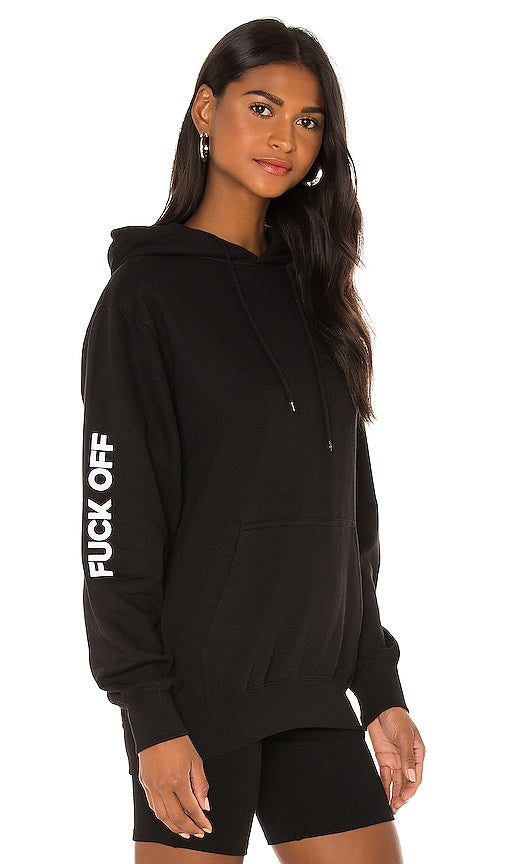 DEPARTURE Fuck Off Oversized Hoodie in Black. - size L (also in M, S) DEPARTURE Fuck Off Oversized Hoodie in Black. - size L (also in M, S) Fuck Off. 80% cotton 20% poly. Made in Pakistan. Machine wash. Drawstring hood. Front kangaroo pockett. Sleeve screen print. DEPT-WK15. 5108-FO. DEPARTURE is a Los Angeles based loungewear brand that offers trend-driven styles for jetsetters everywhere. Embodying the jetsetting glam-life energy, DEPARTURE's clothing is for all explorers and lovers of 'the good life'. Founded by Soraya Khineche, the brand fuses chic airport style with comfy everyday loungewear inspired by her globetrotting experiences. Shop the latest in fashion from DEPARTURE