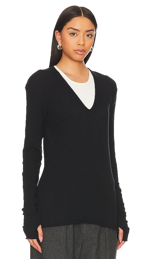 Enza Costa Cashmere Loose V Sweater in Black. - size M (also in L, S, XL, XS) Enza Costa Cashmere Loose V Sweater in Black. - size M (also in L, S, XL, XS) 85% cotton 15% cashmere. Made in USA. Hand wash. Thumbhole design. Raw-cut hem. Ribbed collar. ENZA-WS432. CJ1644. Designed to transform everyday basics into luxury essentials, Enza Costa's unique brand of minimalist, modern clothing is crafted with featherweight blends of sumptuous supima cotton, cashmere and silk. Shop the latest in fashion from Enza Costa