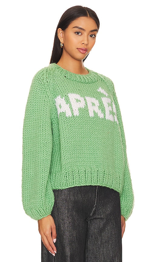 GOGO Sweaters Apres Pullover in Green. GOGO Sweaters Apres Pullover in Green. 100% wool. Handmade in Canada. Dry clean only. Puff sleeves. Heavyweight knit fabric with front graphic. GOGR-WK1. 4800-AP. GOGO was born in the Rocky Mountains of Canada, where beauty, fun and inspiration are plentiful. With a commitment to preserving the time-aged craft of knitting, all GOGO sweaters are hand knit by talented and carefully trained women in Canada. Shop the latest in fashion from GOGO Sweaters