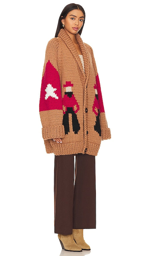 GOGO Sweaters Cowboy Jacket in Brown. GOGO Sweaters Cowboy Jacket in Brown. 100% wool. Made in Canada. Dry clean only. Front button closure. Folded cuffs. Foldover collar. Heavyweight knit fabric with front, back, and sleeve graphics. GOGR-WK7. 3800-LCBJ. GOGO was born in the Rocky Mountains of Canada, where beauty, fun and inspiration are plentiful. With a commitment to preserving the time-aged craft of knitting, all GOGO sweaters are hand knit by talented and carefully trained women in Canada. Shop the latest in fashion from GOGO Sweaters