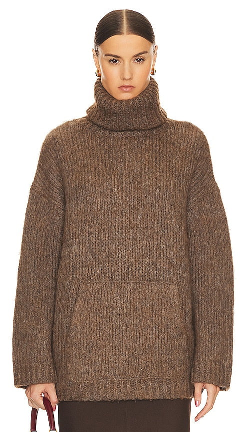 Helsa Janin Sweater in Brown. - size L (also in M, S, XL, XS, XXS) Helsa Janin Sweater in Brown. - size L (also in M, S, XL, XS, XXS) 53% merino wool 30% polyamide 17% alpaca. Made in China. Hand wash. Front kangaroo pocket. Oversized fit. Midweight chunky knit fabric with turtleneck styling. HLSA-WK34. HEK42 H23. Inspired by her Scandinavian heritage, founder Elsa Hosk, honors the philosophy of timeless wardrobe staples, comfort, functionality, and minimalism. Influenced by the colors and materials found in nature, Helsa focuses on an Earth-First approach creating well-made pieces that offer a true sense of confidence and leisure that will last you season after season. Shop the latest in fashion from Helsa