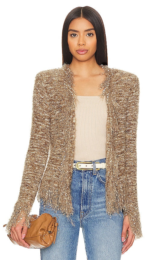 L'AGENCE Azure Cardigan Blazer in Tan. - size L (also in M, S, XL, XS, XXS) L'AGENCE Azure Cardigan Blazer in Tan. - size L (also in M, S, XL, XS, XXS) 60% polyester 40% nylon. Made in China. Dry clean only. Front button closure. Padded shoulders. Fuzzy knit fabric with fil de coupe trim and hem. LAGR-WK113. 8861NLQ. Launched in 2008 by designer Margaret Maldonado, L'AGENCE operates off of a simple concept: washed silks, Japanese and Italian fabrics. Over the years, Maldonado has designed dresses, tops, bottoms and knits from the finest fabrics with the most modern and appealing cuts. Shop the latest in fashion from L'AGENCE