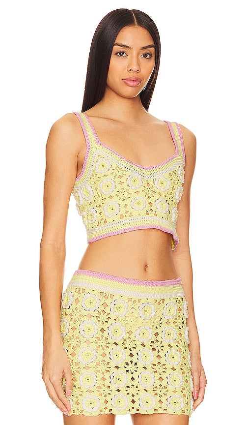 Lovers and Friends Meadow Crochet Top in Yellow. - size M (also in L, S, XS) Lovers and Friends Meadow Crochet Top in Yellow. - size M (also in L, S, XS) Lovers and Friends introduces the Meadow Crochet Top in Yellow. Constructed with crochet fabric, this cropped top completes the perfect springtime look when paired with the matching skirt. 100% cotton. Made in China. Dry clean only. Midweight crochet fabric. Item not sold as a set. LOVF-WS2753. LFK933 S24. Constantly inspired by the laid back Los Angeles lifestyle in which the brand was founded, Lovers and Friends exudes ease and wearability, creating an effortlessly chic look that is California cool. Shop the latest in fashion from Lovers and Friends