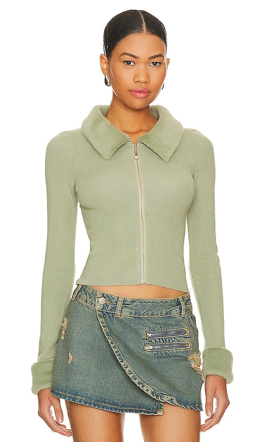 MORE TO COME Natalie Knit Zip Cardigan in Sage. - size M (also in XS) MORE TO COME Natalie Knit Zip Cardigan in Sage. - size M (also in XS) Self: 83% viscose 15% nylon 2% spandex Faux Fur Trim: 100% polyester. Made in China. Hand wash. Front zipper closure. Lightweight knit fabric with faux fur collar and cuffs. MOTO-WK57. MTK2 F21. Shop the latest in fashion from MORE TO COME