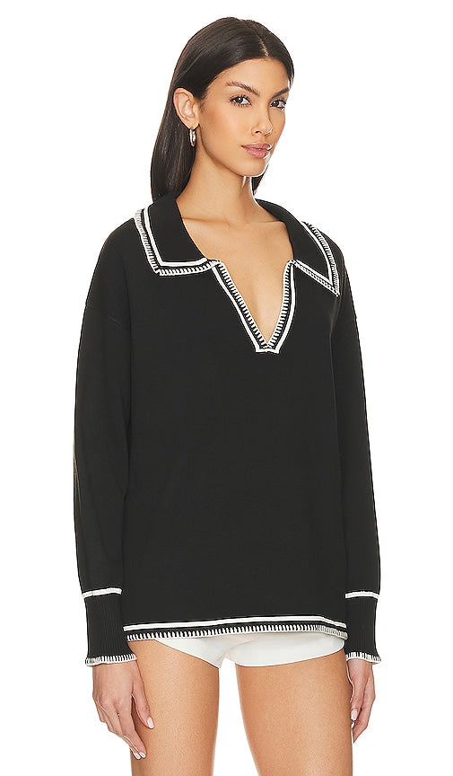 SNDYS Arlington Collared Sweater in Black. - size L (also in M, S, XL, XS, XXL, XXS) SNDYS Arlington Collared Sweater in Black. - size L (also in M, S, XL, XS, XXL, XXS) 100% cotton. Made in China. Machine wash. Knit fabric with contrast embroidery. SDYS-WK49. SFK105. We want women to feel like they don't need permission to showcase their own style. For us, it's always going to be about promoting creativity without contingencies. Directors Melanie Purcell and Lauren Gocher named SNDYS after their favorite day of the week, Sunday, where they would spend time with family and discover new creative outlets. SNDYS offers cutting edge and affordable styles that not only follow trends, but start them. Based out of Sydney, Australia, SNDYS is bold and unabashedly feminine. Expect matching lounge sets, floral maxi dresses, and timeless outerwear. Shop the latest in fashion from SNDYS
