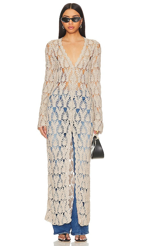 Tularosa Aver Crochet Maxi Cardigan in Beige. - size L (also in S, XS) Tularosa Aver Crochet Maxi Cardigan in Beige. - size L (also in S, XS) Cotton blend. Imported. Hand wash recommended. Front button closure. Midweight open crochet fabric. TULA-WK642. TRD1974 S24. Tularosa, the new LA-based label, is a refined vintage-inspired collection of romantic dresses, textural jackets, and embroidered tops designed for the wild at heart. Shop the latest in fashion from Tularosa