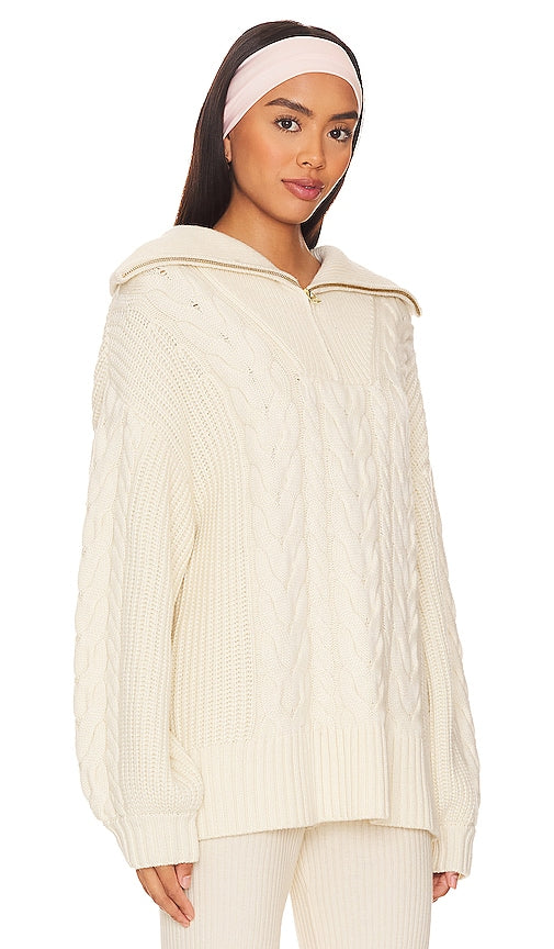 Varley Daria Half Zip Sweater in White. - size L (also in M, S, XL, XS) Varley Daria Half Zip Sweater in White. - size L (also in M, S, XL, XS) 48% nylon 27% viscose 20% wool 5% cashmere. Made in China. Hand wash recommended. Partial front zipper closure. Heavyweight cable knit fabric. VARR-WK114. VAR01669. Varley is a fashion brand rooted in movement. Offering elevated knits, activewear, outerwear and sweats, Varley exists to instill confidence with a curated wardrobe that moves with you and enhances everything you already are. The collection consists of fine fabrics, signature prints and tonal palettes that can be worn all year long. Shop the latest in fashion from Varley