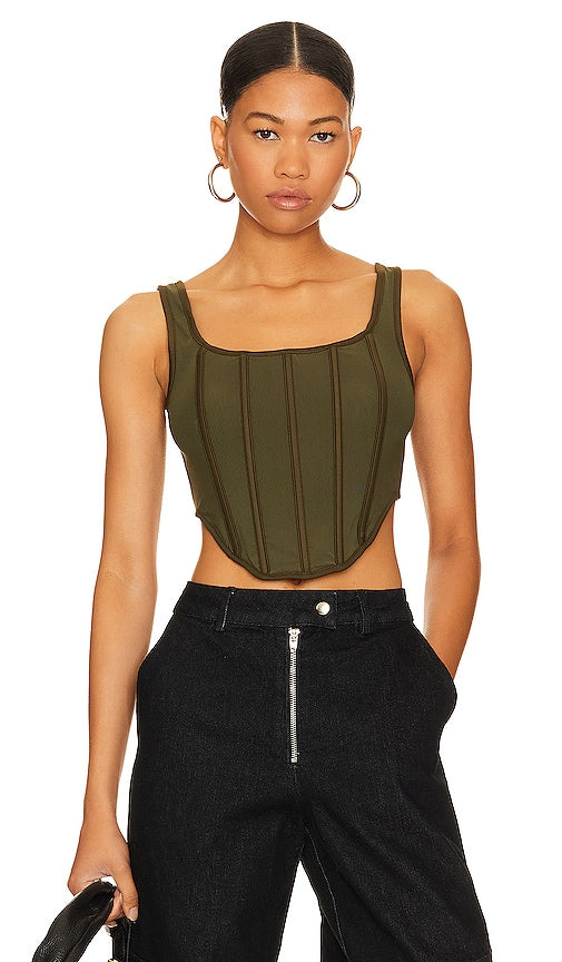 BY.DYLN Clyde Corset in Olive. - size M (also in S, XS) BY.DYLN Clyde Corset in Olive. - size M (also in S, XS) Self: 95% nylon 5% elastane Lining: 95% polyester 5% elastane. Made in China. Machine wash. Back exposed zipper closure. Boned bodice. Mesh fabric with satin contrast detail. BYDR-WS63. DL2076. BY.DYLN dresses the open-minded, strong, and independent woman who isn't afraid to push boundaries. Not one to be conventional, her expressive style gives off a bit of teasing attitude. Core track essentials, signature ribbing, slouchy 90s cuts and form-fitting silhouettes make up BY.DLYN's collection, all rooted in the brand's DNA: feminine designs with a touch of masculine energy. Shop the latest in fashion from BY.DYLN